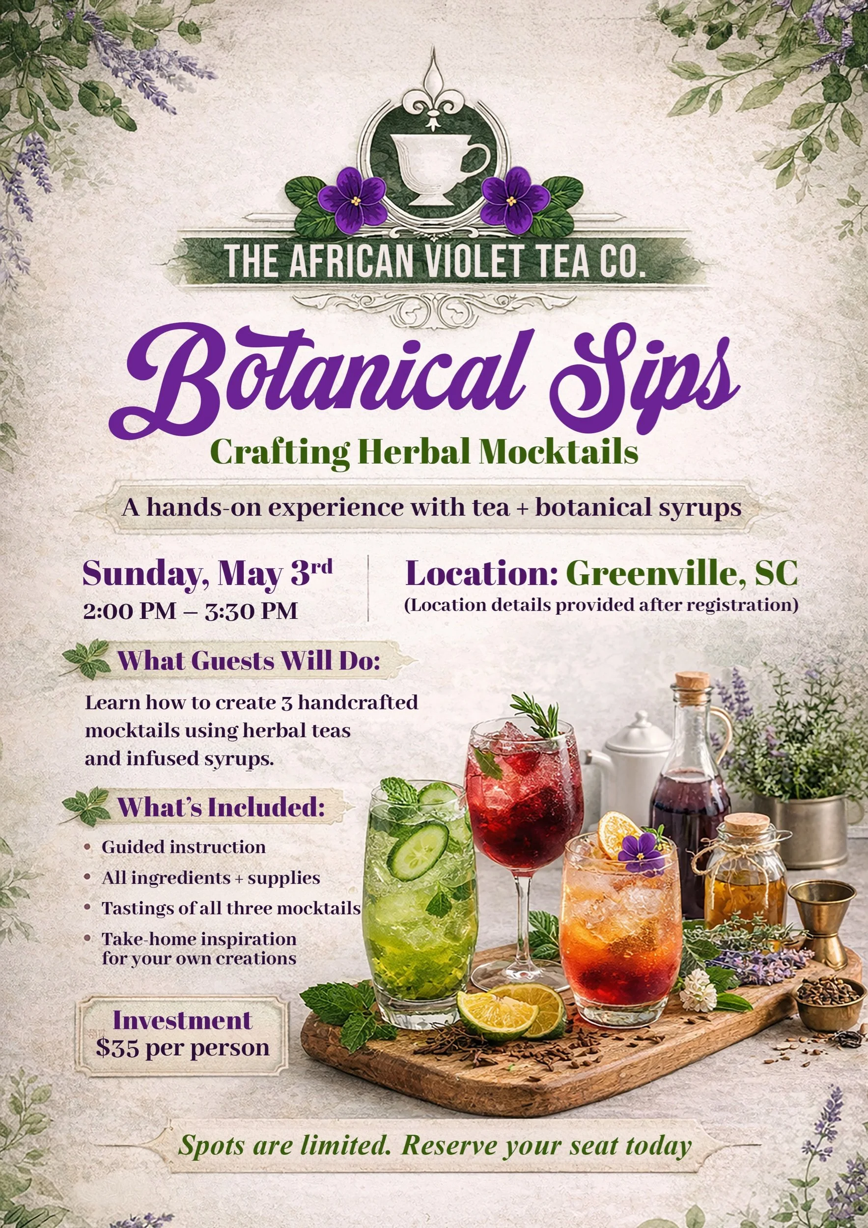 You’ll be guided through the process of building balanced, flavorful drinks while learning techniques you can easily recreate at home. Whether you’re looking to expand your herbal knowledge or simply enjoy a unique and refreshing experience, this class offers the perfect blend of both.